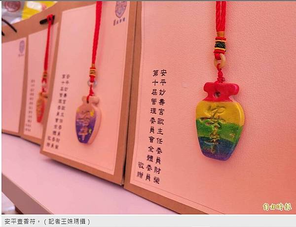 安平壺是少數以地名來命名的台灣瓷器,以安平出土為最多。安平陶坊宋健誠指出,此次設計的香符形狀即為安平壼樣式,壼與福取其諧音,有祈福和保平安的意涵,香符上方曲線則是取自妙壽宮W型山牆意象,並邀書法名家為「妙壽宮」題字;將贈予當天(7/31)參加作十六歲的學子及家長,於現場進行最後上色彩繪的步驟,作成專屬風格的安平壺香符。