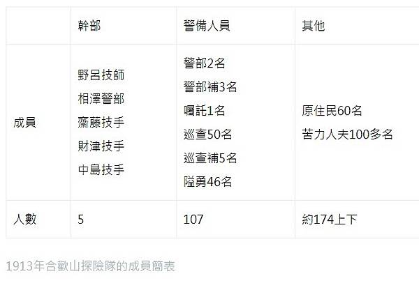 台灣最大山難事件(上)── 合歡山大山難 (野呂寧山難) 2020-07-21 檔案登錄 藍色羊駝/調查員 檔案調閱10,225次 1913年3月22日上午,埔里社,一則來自櫻峰分遣所的電報,打破了埔里社支廳治所的日常。 電報員接獲消息後,緊張地跑過支廳治所內的廣場與長廊,趕忙將這消息告訴當時的埔里社支廳長──依田盛男(福島)警部。依田大吃一驚,確認電報的內容,又通知相關單位消息,並緊急招募人手與物資,整個埔里社支廳瞬間忙碌起來。 合歡山探險隊出事了。 那可是人數將近300人的龐大探險隊啊!裡面有60人是他的同僚,而隊伍中有一半以上的人,可都是他安排進去的! 依田支廳長仰頭看向合歡山方向。平日晴朗時,可看見到的層層山巒及那白雪靄靄、閃閃發光的美麗山峰,此時已被灰重的烏雲遮住、籠罩。他的雙眉緊鎖,內心的不安止不住地膨脹。 拜託,不要像八甲田山事件那樣。 「我們必須以最快速度前往櫻峰。」依田支廳長宣布,準備好簡單的物資後,率領數十名巡查以及隘勇,中午即動身前往櫻峰分遣所,與臨時召集來的100多名原住民集合,投身進入台灣史上最大山難的救援行動。 為什麼會出事?野呂技師不是經驗豐富嗎?探險隊的傷亡狀況如何?有受到太魯閣蕃(タロコ蕃)的攻擊嗎?帶著滿腹疑問與擔憂,依田抵達櫻峰分遣所。 殘存的探險隊 依田支廳長抵達櫻峰時,已經是22日晚上,櫻峰分遣所內只有野呂寧技師(東京)以及幾位探險隊幹部、幾位他派來的警備人員。 正在交代雜項的野呂技師,也是這次探險隊領隊,前來向依田說明:「櫻峰分遣所住不下全部人員,其他人都已經分散到附近的分遣所了。」 依田環視周圍,探險隊員正幾個人裹著一條毛毯,擠在一起勉強取暖,但分遣所內有溫暖的火堆,食物也還算充足,暫時看起來沒有性命之憂,稍微放心些:「那失蹤的人有多少呢?」 野呂稍微沉默後回答:「平安無事的有57人。」 依田一驚,瞬間醒悟這次探險傷亡程度有多嚴重。 「探險隊原本不是有280人左右嗎?其他人呢?」 「一部分凍死,一部分失蹤。」 野呂看著依田震驚的表情,嘆了一口氣道:「既然你們明天才能進行搜救,我先跟你說明這幾天發生的事情。」 依田點頭,跟隨行的部屬交代事項後,回到分遣所內找野呂,聽他娓娓道來。 「我們這次的探險任務,是要繪製地圖,蒐集太魯閣蕃的情報,並且基於過往經驗,這次等測候所告訴我們會是好天氣後,我們才出發,且為了防範被蕃人攻擊,這次帶了很多人上山……」 五年理蕃計畫 台灣總督府為了將台灣全島納入控制範圍,推出一系列理蕃政策,並以「隘勇線推進」與「五年理蕃計畫」,正式將台灣內山大多原住民領域納入行政管轄範圍中。 隘勇線的構想,是源於台灣所遺留的清代隘勇制度,但在理蕃的目標上,卻更加凶狠、有效。1875年台灣開山,原本涵蓋內山外圍的番界禁墾令解除,漢人開始可以合法進入內山開墾,為了自保,漢人會在開墾地附近設立隘寮,聘僱隘勇(隘丁)防守;日治初期,台灣總督府讓各地設隘寮保持自行防禦的狀態,直至1902年的「南庄事件」(發生於新竹廳南庄支廳南庄區南庄的抗日事件)後,總督府理蕃態度轉為積極,將隘勇納入警察本署管理,並透過推進隘勇線,包圍尚未在日本行政控制下的原住民領域,阻絕部落對外的生活物資交易管道,逼迫原住民投降。 所謂的隘勇線,是由道路與防禦工程所組合而成的警備線: 警備單位規模由小到大,分別為:隘寮、分遣所、監督所 警備人員有:警部、警部補、巡查、巡查補、隘勇 在官方規定中,隘勇線線幅約18公尺寬,可視地形而有所增減 隘勇線上另有隘路,主要用於巡邏使用,路幅約90〜120公分寬 另設置通電鐵絲網、地雷、木柵等防禦工程,用以包圍與禁止原住民越過隘勇線。 南投縣境內的隘勇線。圖源:鄭安睎,〈日治時期蕃地隘勇線的推進與變遷(1895〜1920)〉,台北:國立政治大學民族學系博士論文,2011,頁280。 雖隘勇線推進,使台灣總督府的勢力逐漸滲入台灣內山,但還是有許多部落群有能力反抗總督府滲入。於是1910年,在新任台灣總督佐久間左馬太的力推下,位於東京的日本國會通過「五年理蕃計畫」,編列經費1,630萬圓,確定以武力鎮壓的手段強迫未歸順的原住民投降,並將武力討伐的焦點,對準頑強抵抗的「北蕃」(泰雅族)與「太魯閣蕃」。 為了有效討伐,並規劃隘勇線及後續的理蕃道路,總督府多次派遣地圖測繪技師隨同警察、隘勇,進入內山進行調查,以了解地形與部落分布狀況。1911年12月,總督府派遣測繪技手財津久平(大分)前往奇萊主山與合歡山方面調查,觀測太魯閣山地地形,卻在抵達鞍部時遭到太魯閣蕃襲擊而失敗。 於是,1913年太魯閣調查計畫捲土重來。 合歡山探險隊,出發 野呂寧是一位曾測量新高山(玉山)、鹿場大山等眾多台灣高山的重要測繪技師,且早在1910年就曾帶隊前往合歡山探險。 1910年2月由蕃務本署下達命令,野呂寧於2月27日在埔里社與財津技手、殖產局的森囑託、花蓮港廳的本田警部、南投廳埔里社支廳長依田警部,以及其下2名警部、2名警部補、10名巡查、7名巡查補,隘勇20人、苦力人夫10多人,共50多人的探險隊,經由霧社與隘勇線,抵達櫻峰分遣所,卻因天氣不好,直至3月2日大晴天才出發前往合歡山,並在下午2點30分抵達合歡山南峰,見山頂平坦廣闊,又有一低窪處聚起積水,恰巧此時變天,探險隊於是在此紮營。然而,隨著風勢漸增,探險