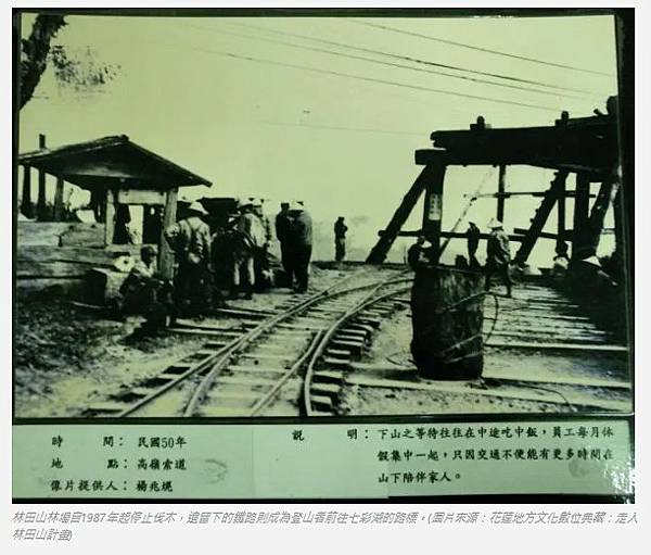 林田山林場自1987年起停止伐木,遺留下的鐵路則成為登山者前往七彩湖的路標。(圖片來源:花蓮地方文化數位典藏:走入林田山計畫)
