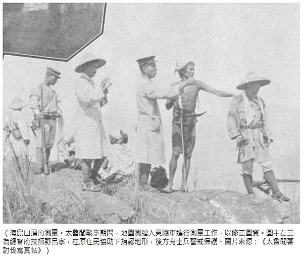 (海鼠山頂的測量。太魯閣戰爭期間,地圖測繪人員隨軍進行測量工作,以修正圖資。圖中左三為總督府技師野呂寧,在原住民協助下指認地形,後方有士兵警戒保護。圖片來源:《太魯閣蕃討伐寫真帖》)