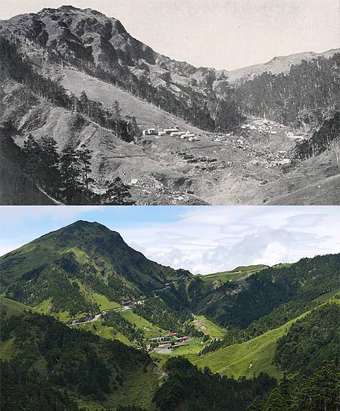 上圖:合歡山「根據地」,在主峰與東峰間的坳地。步兵第二聯隊在此集結,並以此為物資集散點。圖片來源:《大正三年太魯閣蕃討伐軍隊記念》寫真帖。下圖為合歡山「根據地」今景,即武嶺下方的寒訓中心所在地。朱和之攝。