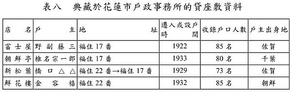 台灣本島人(漢人)經營的貸座敷:真花園、玩春園、愛月園、樂春樓、小春園、昭和樓、浪花樓、桂花亭、新春閣