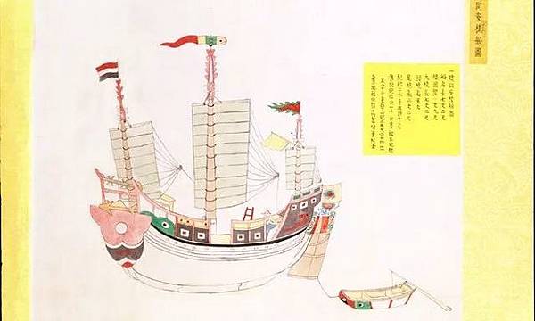明朝皇帝派遣鄭和下西洋敕造的福船。船體高大如樓,底尖上闊,艏艉高高翹起,艏尖艉方,兩側有護板。當時中國的造船業遙遙領先全球。鄭和七次下西洋,其真實目的,並不完全是宣揚國威,至少有一部分目的是要以官方貿易的朝貢之路代替過去的民間貿易。