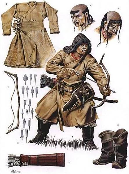 雖然蒙古弓騎手跟塞西亞弓騎手一樣穿土耳其(波斯)式長袍,但他們的長袍較樸實,沒有花巧的刺繡。