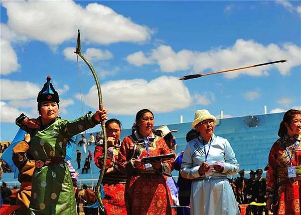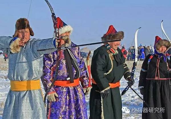 圖為正在訓練弓箭射擊的蒙古士兵,使用的是蒙古複合反曲弓,弓背由木材、牛角和肌腱複合製成。