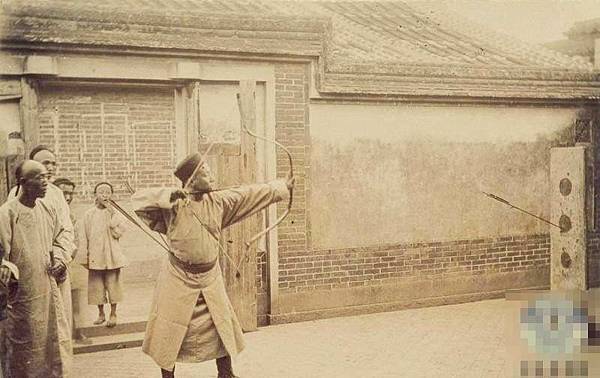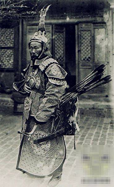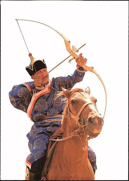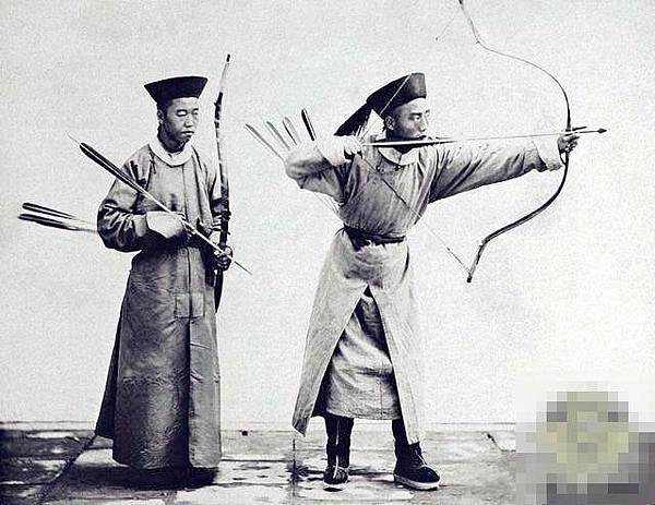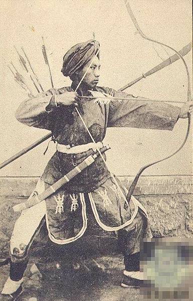 晚清時期,一位騎馬正在彎弓射箭的蒙古族士兵。弓箭是冷兵器時代,蒙古族等遊牧民族最主要的武器。歷史上,成吉思汗率領著蒙古騎兵建立了龐大的蒙古帝國。而當時蒙古騎兵最主要的武器裝備便是弓箭。蒙古騎兵使用比較現代化的複合弓。這種弓的威力超大,至少需要150磅的拉力,射擊距離為4000碼至7000碼。騎兵們身帶兩種箭,一種輕,一種重。
