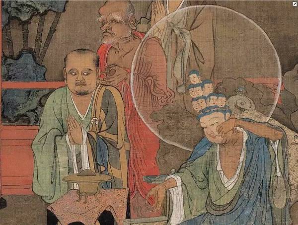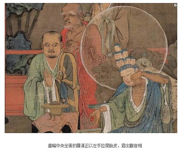 畫幅中央坐著的羅漢正以左手拉開臉皮,露出觀音相