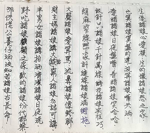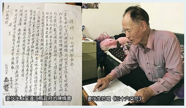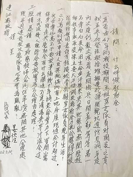 他的硬筆字也寫得極好,端正清麗,筆畫勾勒毫不含糊,曾一字一字手抄《三十六朵花》、《百樣諸娘仔》等福州經典唱曲。其中還有一封,抗議國防部差別對待金門與馬祖民防隊的陳情書,幾首恭賀縣長與立委當選人的古體詩。