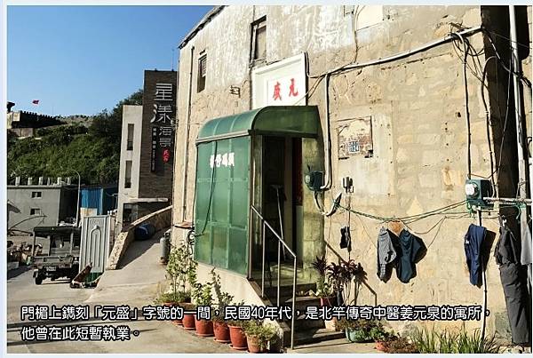 其中門楣上鐫刻「元盛」字號的一間,民國40年代,是北竿傳奇中醫姜元泉的寓所,他曾在此短暫執業。