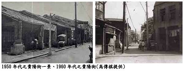 淡水河畔第一水門附近,因有新店溪、大漢溪匯合而成的大河面,所以往昔稱此處為「大溪口」。有地契史料記載,早在約清康熙 48 年(1709)間,已有漳、泉等移民來此拓墾。當時在此生息活動的平埔族,競相划著獨木舟載運蕃薯等土產前來交易,漸漸形成買賣墟市,俗稱蕃薯市,街衢稱蕃薯市街。至清雍正後,大溪口岸邊群舟蟻聚,平埔族語稱獨木舟為「莽葛」,遂取音似的「艋舺」為庄名。1950 年代之貴陽街一景、1960 年代之貴陽街(高傳棋提供) 至乾隆年間,媽祖宮(廟)、土地公廟、清水祖師廟等寺廟相繼落成,貴陽街隨之往東延展。西園路至西昌街為直街仔,又稱直興街,意即新興宮前直往東行的街道。而過土地公廟至康定路口清水祖師廟一帶,早年以草厝為店舖,土名「草店尾」。泉州同安縣人在祖師廟後方,即今日柳州街、貴陽街、永福街的範圍形成八甲庄,有祖師廟前街、祖師廟後街與歡慈市街交通。光緒 3 年(1877),加拿大籍馬偕牧師毅然來到傳統宗教信仰濃厚的艋舺傳教,幾經挫折終於在八甲庄建立艋舺教會。 隨著艋舺躍為臺北貨物出口中心,蕃薯市集散的貨物不僅蕃薯而已,臺北市各式土產如大菁、苧、麻、茶葉、煤等,都一擔擔堆積街上待售。慘烈的頂下郊拼爆發後,泉州府惠安縣漁民於咸豐 4 年(1854),奉青山王(靈安尊王)神像來臺, 3本單元相關資料,直接擷取參考至李秀美發表於「囝仔影音公社」http://www.cm-workshop.com/index.php裡有關萬華區境內各街道之相關文章與資料,此資料也曾發表於 2003 年 3 月之《臺北畫刊》。66創建青山宮。到了同治年間,艋舺因為頂下郊拼已經大傷元氣,民風又不易接納外國貿易商,加上淡水河淤積影響航運,繁華逐日黯淡。 日治時期,總督府鑑於艋舺街道狹窄、住宅密集,遇空襲時易引起大火,遂於明治 41 年(1908)實施市區改正,將街道拓寬並取直,貴陽街因此接通至城內東門街第一高女校門口(公園路)。此時,蕃薯市街已雅稱歡慈市街,並劃入「遊廓」(風化區),旗亭娼樓蜂起,日籍住民漸多,原有的閩南紅磚厝翻建為日式黑瓦屋,店家以巴洛克洋樓為風尚,街景丕變。西園路口一棟掛著日本料理店招牌的顯目洋樓,原是著名西醫李朝北經營的「朝北醫院」(前臺大醫學院李鎮源院士為其女婿)。 昭和 13 年(1938)直興市場開幕,市場附近頓時商號聚集,香燭舖、中藥舖、雜貨舖、糕餅店、米粿店、棉被店、綢緞莊、旗袍店、百貨行、糊紙店、茶葉莊,開業至今成了和傳統街屋互相依存的「老行業」。據 1943 年間出生在歡慈市街的在地人黃應時表示:「戰後初期他的父親擔任地方里長,昔日遊廓內的酒肆妓院,全數被政府接收做為公家宿舍,不出數年釋給民間承購。還未和新朋友混熟,黃應時的外省鄰居們又一一遷離」。 因貴陽街僅能單行通車,新興行業多不願在此開店,1978 年才拓寬並打通騎樓。1981 年,黃應時承父職擔任青山里里長,20 多年來,歡慈市街維持著 2至 4 樓住宅商店的舊模樣。縱使張燈結彩、杯光鶯影的歲月已遠離,但是艋舺第一街的風采,在廟口聽講古長大的黃應時這一代,隨時能娓娓道來。 從珍貴黑白舊照片中,明顯可看出昔日這條老街繁榮,船頭行、郊商、當舖、旅館等各式商家與對外貿易活動在此熱絡開展。今日位於萬華區境內之貴陽街 2段一帶,仍處處可見當年因經商活動所留存至今之大瓦厝、紅磚店屋、亭仔腳(騎樓)、鑲嵌在店屋建築物前之各式店家招牌,以及近年才蓋改建或興建出的橢圓形公園、青山王宮與祖師廟之豪麗廟門牌樓、人行徒步道等等空間設施。在在地述說著貴陽街為臺北第一街,實質名歸。