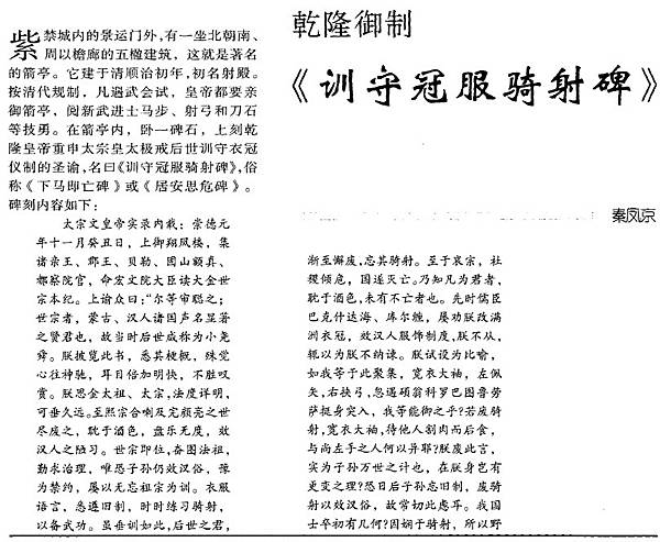 此外,乾隆帝還命人將此諭令刻成《訓守冠服國語騎射碑》,分別在紫禁城箭亭、御園引見樓(圓明園)及侍衛教場(北海)、八旗教場(紫光閣),「以昭膚詔述推廣之意」,使諸王貝勒和八旗官兵「咸知滿洲舊制,敬謹遵循,學習騎射,嫻熟國語,敦崇淳樸,屏去浮華,毋或稍有怠惰」。