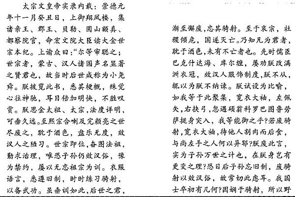 "爾等審聽之:世宗者,蒙古、漢人諸國聲名顯著之賢君也,故當時後世鹹稱為小堯舜。 朕披覽此書,悉其梗概,殊覺心往神馳,耳目倍加明快,不勝嘆賞。 朕思金太祖、太宗,法度詳明,可垂久遠。 至熙宗合喇及完顏亮之世盡廢之,耽於酒色,盤樂無度,效漢人之陋習。 世宗即位,奮圖法祖,勤求治理,惟恐子孫,仍效漢俗,豫為禁約,屢以無忘祖宗為訓。 衣服語言,悉遵舊製,時時練習騎射,以備武功。 雖垂訓如此,後世之君,漸至懈廢,忘其騎射。 至於哀宗,社稷傾危,國遂滅亡。 乃知凡為君者,耽於酒色,未有不亡者也。 先時儒臣巴克什達海、庫爾纏,屢勸朕改滿洲衣冠,效漢人服飾制度,朕不從,輒以為朕不納谏。 朕试設為比喻,如我等於此聚集,寬衣大袖,左佩矢,右挾弓,忽遇碩翁科羅巴圖魯勞薩(滿洲封號,意為"勇士"、"英雄")挺身突入,我等能禦之乎? 若廢騎射,寬衣大袖,待他人割肉而後食,與尚左手之人何以異耶?朕发此言,實為子孫萬世之計也,在朕身豈有更變之理? 恐日後子孫忘舊制,廢騎射以效漢俗,故常切此慮耳。 我國士卒初有幾何? 因嫻於騎射,所以野戰則克,攻城則取,天下共稱我兵曰立則不動搖,進則不回顧,威名震懾,莫與爭鋒。此番往徵燕兵出邊,我之軍威竟為爾八大臣所累矣,故谕爾等:其謹識? 朕言。 欽此。"朕(乾隆)每敬讀聖谟,不勝欽凜感慕。