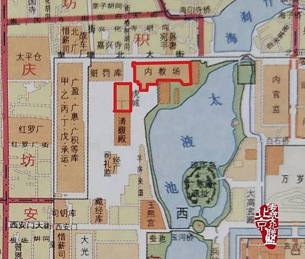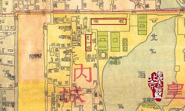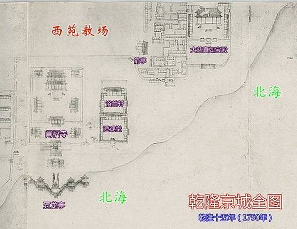 乾隆十五年,京城全圖上的北海西北隅的教場稱西苑教場,圖源網絡。