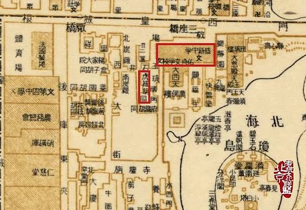 1948年北京地圖上的佑貞女中與盛新中學,西側可見虎城胡同。