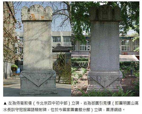 ▲ 左為侍衛教場(今北京四中初中部)立碑,右為御園引見樓(即圓明園山高水長訓守冠服國語騎射碑,位於今國家圖書館分館)立碑,圖源網絡。