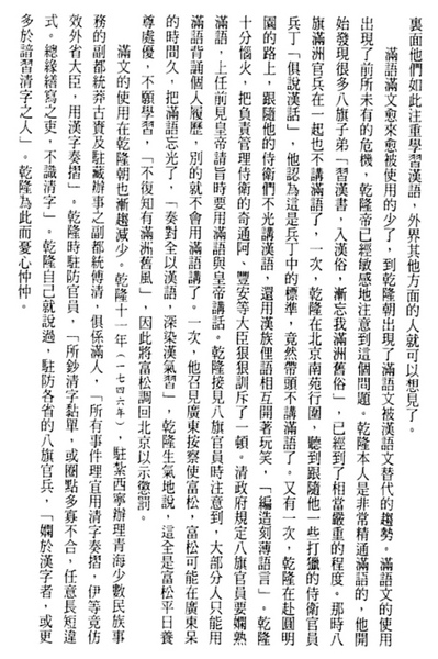 一次,他(乾隆)召見廣東按察使富松.富松可能在廣東待的時間久,把滿語忘光了,「奏對全以漢語,深染漢氣習」,乾隆生氣地說,這全是富松平日養尊處優,不願學習,「不復知有滿洲舊風」,因此將富松調回北京以示懲罰.