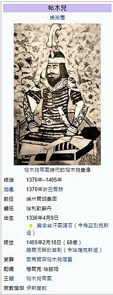 帖木兒(波斯-阿拉伯文:تیمور,拉丁轉寫:Tēmōr,1336年4月8日-1405年2月18日),突厥化蒙古人,或譯帖木耳,帖木兒汗國的創始埃米爾,為察合臺語「鐵」之意,出身於蒙古巴魯剌思氏部落[1][2][3],1362年與忽辛合作,在故鄉附近地區起事時,被打傷,從此跛腳,因此人稱跛子帖木兒,另外帖木兒可操流利波斯語、土耳其語及蒙古語。因為他娶了東察合台汗國後王黑的兒火者的女兒為妻,所以又被稱為駙馬帖木兒。他打敗了西亞、南亞和中亞的其他國家,是帖木兒帝國的奠基人。帖木兒 - 維基百科,自由的百科全書 https://bit.ly/2PnRqOY