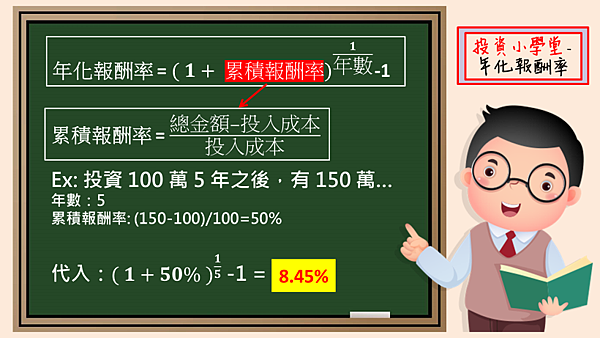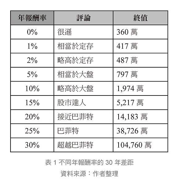 舉例而言,如果一個剛進入職場的25歲年輕人,每月能存下3,000元投入年化報酬率6%的投資標的,那麼30年後他的資產將累積至2,846,095元;假如他找得到年化報酬率10%的投資標的,那麼30年後他的資產將累積至5,921,785元。再假設這個年輕人投入到年化報酬率15%的投資標的,則30年後他的資產將累積至15,650,825元+以股票而言,長期的報酬率落在6%至7%之間。如果投資人設定追求25%以上的報酬率,就顯得不切實際。大家所熟悉的股神巴菲特,其多年來平均投資報酬率也不過接近20% https://is.gd/LUJXNM