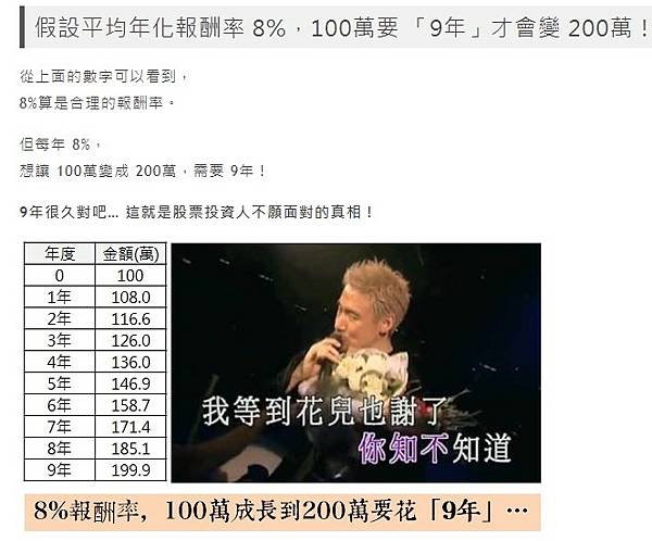 假設平均年化報酬率 8%,100萬要 「9年」才會變 200萬!