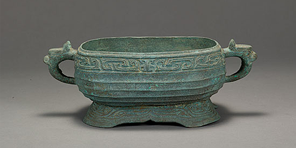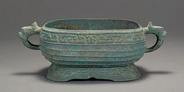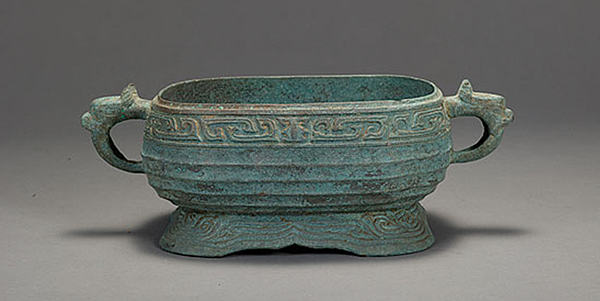陽徵集 缺蓋,器身斂口,腹外鼓,平底,花邊形圈足外撇,腹兩側各有獸首銜環。 器身飾獸面紋、凸棱紋、幾何雲紋等。 內底有篆書銘文"大元大德己已年四月壹日丙子潭州路瀏陽州文靖書院作寶彝恭祀□□其攸司萬年永保用。 ""大德"為元成宗的年號,從1297-1307年,共9年。 己已年為大德第六年,即1302年。 潭州是隋朝至明朝時期州治或府治長沙的古稱,曾作為一級行政單位,是大部分湖南地區以及部分湖北地區在古代的稱呼;也曾作為二級行政單位,地域包括今長沙、湘潭、株洲、岳陽南、益陽、婁底等地。 元至元十四年(1274年),改潭州為潭州路,為湖廣等處行中書省治所。