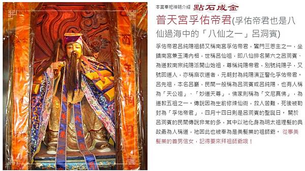 孚佑帝君呂純陽祖師又稱南宮孚佑帝君,鸞門三恩主之一,坐鎮南宮兼玉清內相,世稱呂仙祖,即八仙排名第六之呂洞賓、為道教南宗純陽派開山始祖,尊稱純陽帝君,別號純陽子,又號回道人,亦稱麻衣道者,元朝封為純陽演正警化孚佑帝君。 呂先祖,本名呂巖,民間一般稱為呂洞賓或呂純陽,也有人稱為「天公祖」、「妙道天尊」,佛家則稱為「文尼真佛」,為道教五祖之一。傳說因為生前修煉仙術,救人苦難,死後被勒封為「孚佑帝君」,四月十四日則是呂洞賓的聖誕日。 關於呂洞賓的民間傳說非常的多,其中以祂化身為明太祖理髮的典故最為人稱道,祂因此也被奉為是美髮業的祖師爺。 從事美髮業的善男信女,記得要來拜祖師爺哦!