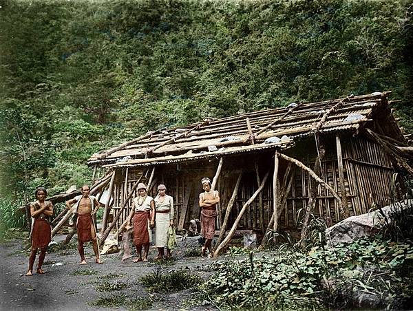 1910年代,幾位泰雅族人在竹造的住宅前方合照,飼養的犬隻則在屋內休息乘涼,後方的山拔地而起、壯觀宏偉。泰雅族的建築物會根據不同需求建造,圖為半穴式的住家,泰雅族實施每家一屋的原則,在父母過世後,家中的兄弟們必須要另建新屋並且一起收集建築所需要的材料,泰雅族的家屋皆為一個方正的矩形,床通常會擺在角落邊,中間的空間則為日常生活起居用。(1) 英國攝影家湯姆生1871臺灣線性文化遺產 | 泰雅族人山前家屋與犬隻 | Facebook https://bit.ly/3U1sQjN