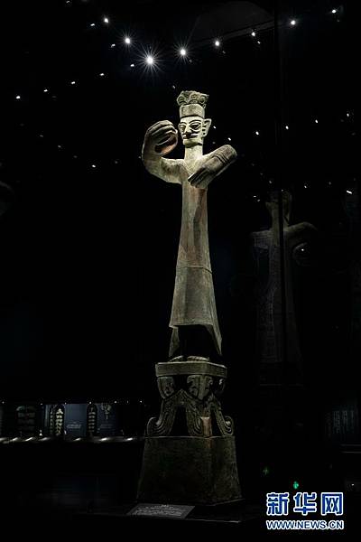 這是在三星堆博物館拍攝的「青銅大立人」(3月17日攝)。 該文物於1986年從三星堆2號"祭祀坑"出土。 新華社記者 沈伯韓 攝