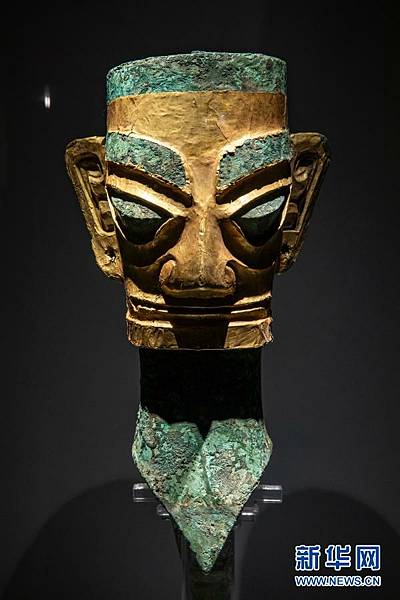 三星堆博物館裡的「戴金面罩青銅人頭像」。該文物於1986年從三星堆二號「祭祀坑」出土。(新華社)