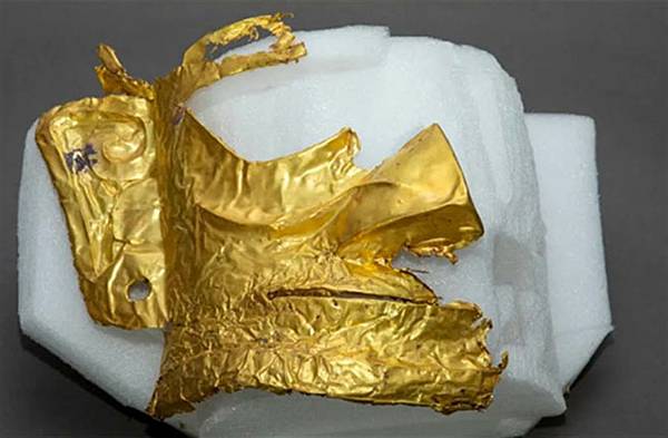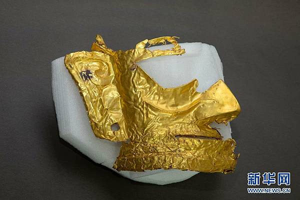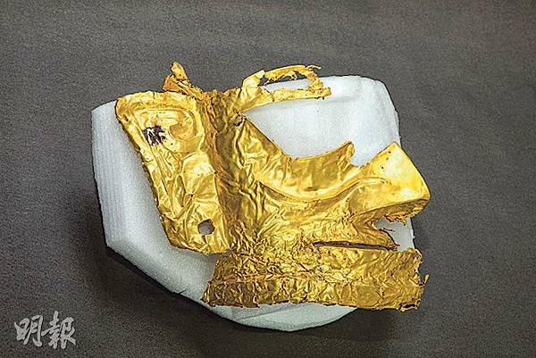 三星堆遺址考古發掘現場五號「祭祀坑」出土的殘缺的金面具。(新華社)