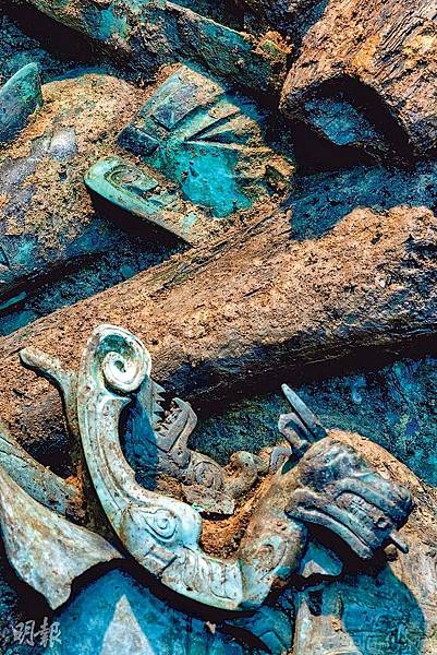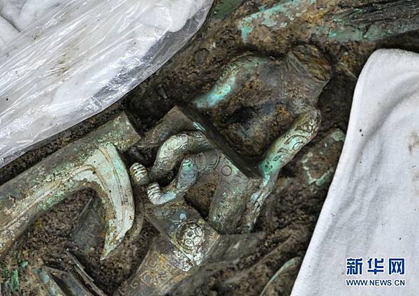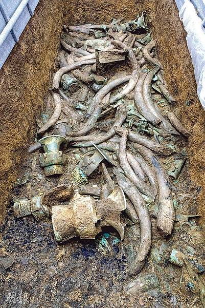 三星堆考古發掘現場7、8號「祭祀坑」發現的大量象牙及青銅器、玉器。(圖擷取自網路新華網)