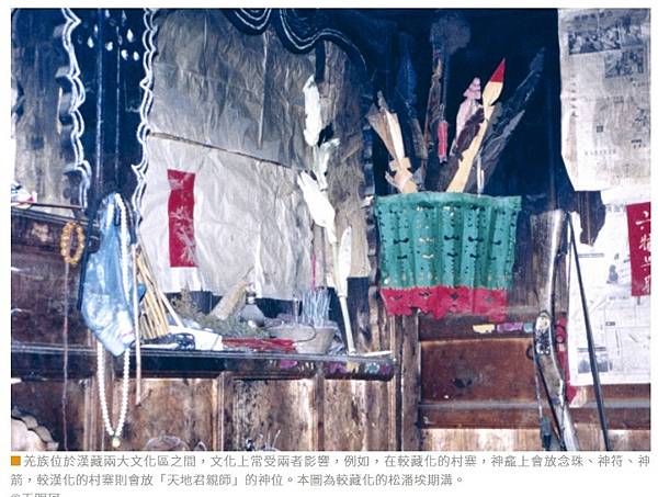羌族位於漢藏兩大文化區之間,文化上常受兩者影響,例如,在較藏化的村寨,神龕上會放念珠、神符、神箭,較漢化的村寨則會放「天地君親師」的神位。本圖為較藏化的松潘埃期溝。