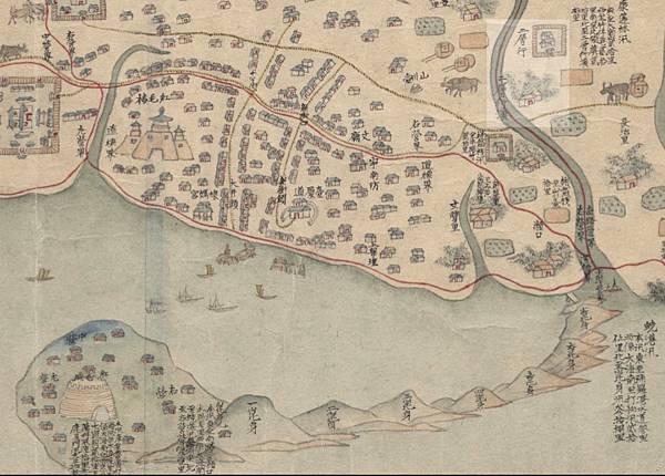 《台灣番社圖》,下面是西方。明亮處顯示二層行是在二層行溪的南方,乃是錯誤。