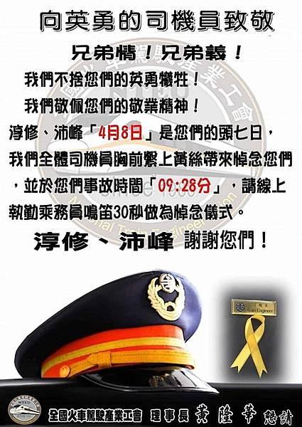 〔記者陳心瑜/台北報導〕0402太魯閣號408車次出軌事故將屆滿一週年,事故中罹難的助理司機員江沛峰今天入祀忠烈祠。全國火車駕駛產業工會下午召開記者會,希望江沛峰的犧牲能喚醒交通部對安全的覺醒。全國火車駕駛產業工會理事長黃隆華說,台鐵加速公司化就是因為這起事故,但卻23日在立法院公聽會完全聽不到對於安全的討論。