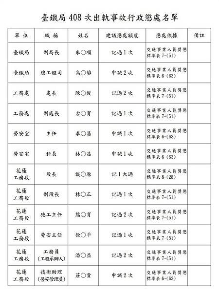 今年4月2日台鐵太魯閣號事故造成49死,交通部台鐵局今公布行政責任報告,並擬定12人懲處名單,其中包含副局長、總工程司、處長、段長等記申誡至大過。台鐵表示,本案就施工業者、設計監造與專案管理廠商違反契約及作業規定,台鐵相關人員涉有督導、管考不周予以究責,相關懲處將於運安會及交通部鐵道局發布事故調查時,再予以檢討修正。