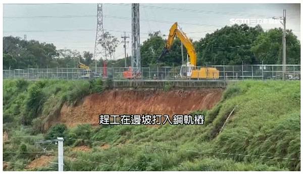 搶修機具擠在上頭,趕工在邊坡打入鋼軌樁,受到連日豪雨襲擊,高鐵通宵坪頂路段塌出大凹洞,行政院長蘇貞昌勘災視察。
