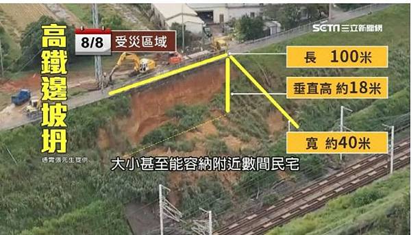 8月7日中午12點,民眾拍下綠油油邊坡少了大半露出紅土坡,相隔1小時上方綠草皮消失了,8日受災景像曝光,長100米、寬約40米、垂直高度18米,大小甚至能容納附近數間民宅,崩落土石毀壞圍欄,更入侵路線岌岌可危,全靠預警系統救了一車人。