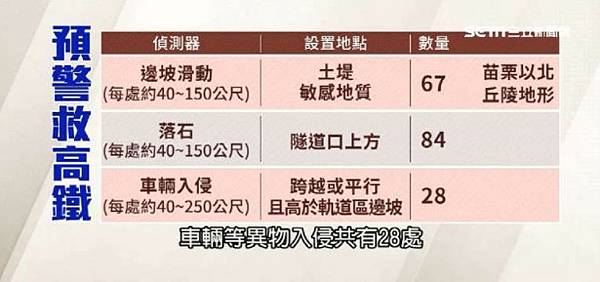 高鐵全線邊坡偵測器有3種,這次即時發揮作用的屬於邊坡滑動偵測器,設置在土堤或敏感地質旁,多在苗栗以北丘陵地形,全台共有67處;落石偵測設在隧道口上方;車輛等異物入侵共有28處。