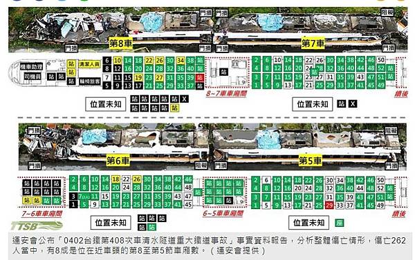運安會公布「0402台鐵第408次車清水隧道重大鐵道事故」事實資料報告,分析整體傷亡情形,傷亡262人當中,有8成是位在近車頭的第8至第5節車廂數。(運安會提供)