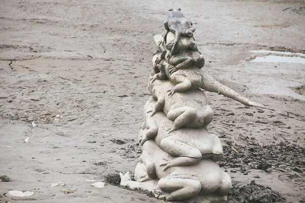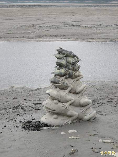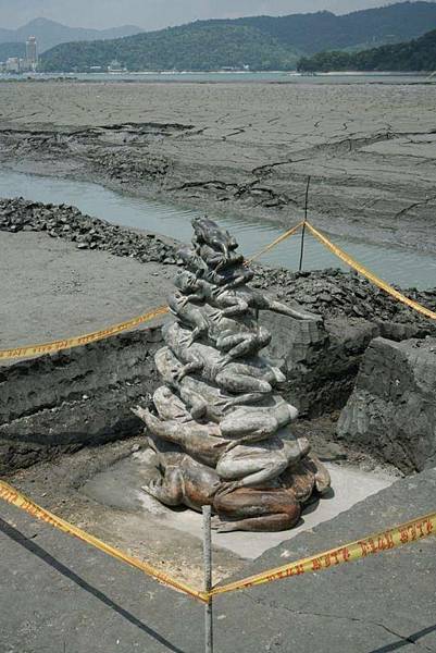 日月潭「水蛙雕塑」景點,因乾旱水位下降,闊別十多年後,九隻蛙再度全都露。 圖:張良一/攝