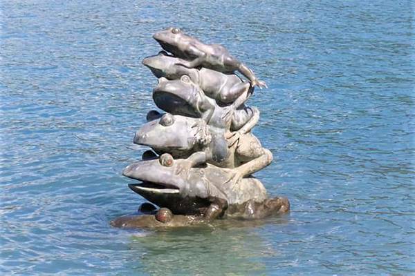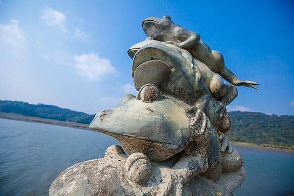 九蛙疊像:由南投縣政府風景區管理所委託工程顧問公司設計,聘請藝術家沈政瑩打造七公尺銅雕,目的在宣導當地「水蛙頭」豐富生態,而設置於步道旁的陸(旱) 蛙。「水蛙頭」因棲息許多蛙類而得名,沿線步道約有500公尺,因濕度高,蕨類植物生長良好,蝴蝶、水鳥也常在此覓食,長有蛙類出沒,成為潭區生態多樣性的步道。九蛙疊像於2000年日月潭管風景管理處成立後,轉移撥給其管理 ,為凸顯日月潭抽蓄發電水位變化,才將九蛙移至潭中成為「水蛙」,讓到訪遊客能觀察每天水位有近2公尺的落差變化,故平常因水位消長只會露出二隻青蛙,要遇旱象水位見底,九蛙疊像才會全部露臉,這時會招攬大批觀光客前來觀賞,成為知名景點 日月潭 - 維基百科,自由的百科全書 https://bit.ly/3cMSKnL