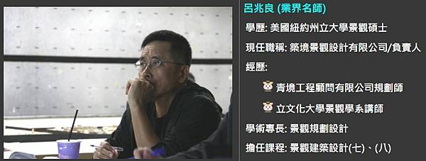 壁畫繪製是沈政瑩老師近期投入的創作重點,他一直期望像加拿大的壁畫鎮一樣的作出有歷史性的代表作。各位朋友若有機會到埔里旅遊的時候,歡迎到埔里各公開壁畫景點中,把握機會,好好的欣賞沈老師的作品。(本文作者 為埔里藝文工作者) 業界師資 呂兆良 老師 - 中華大學景觀建築學系