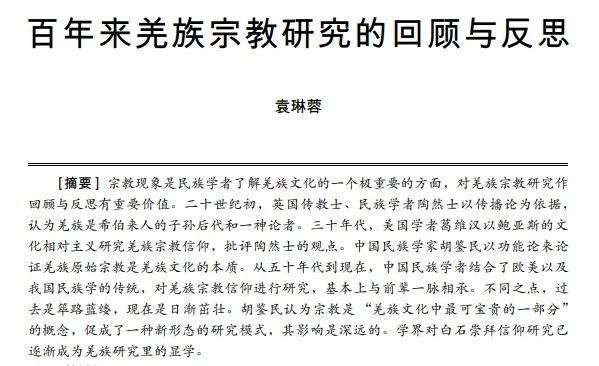 宗教現像是民族學者瞭解羌族文化的一個極重要的方面,對羌族宗教研究作回顧與反思有重要價值。 二十世紀初,英國傳教士、民族學者陶然士以傳播論為依據,認為羌族是希伯來人的子孫後代和一神論者。 三十年代,美國學者葛維漢以鮑亞斯的文化相對主義研究羌族宗教信仰,批評陶然士的觀點。 中國民族學家胡鑒民以功能論來論證羌族原始宗教是羌族文化的本質。 從五十年代到現在,中國民族學者結合了歐美以及我國民族學的傳統,對羌族宗教信仰進行研究,基本上與前輩一脈相承。 不同之點,過去是篳路藍縷,現在是日漸茁壯。 胡鑒民認為宗教是"羌族文化中最可寶貴的一部分"的概念,促成了一種新形態的研究模式,其影響是深遠的。 學界對白石崇拜信仰研究已逐漸成為羌族研究里的顯學。