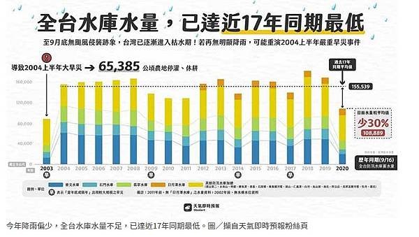 台灣素有「三年一小旱、五年一大旱」的說法,從2002年到2020年有8次旱災、4次停灌休耕,如今大旱來得又急又猛,在降雨量不斷創新高的同時,也不斷往下探底,兩次大旱間,台灣做了哪些準備?我們如何撐過這一次? 「2021年沒水種田了」 嘉南平原休耕,台灣如何挺過56年最慘大旱? https://bit.ly/2Q7NnGL