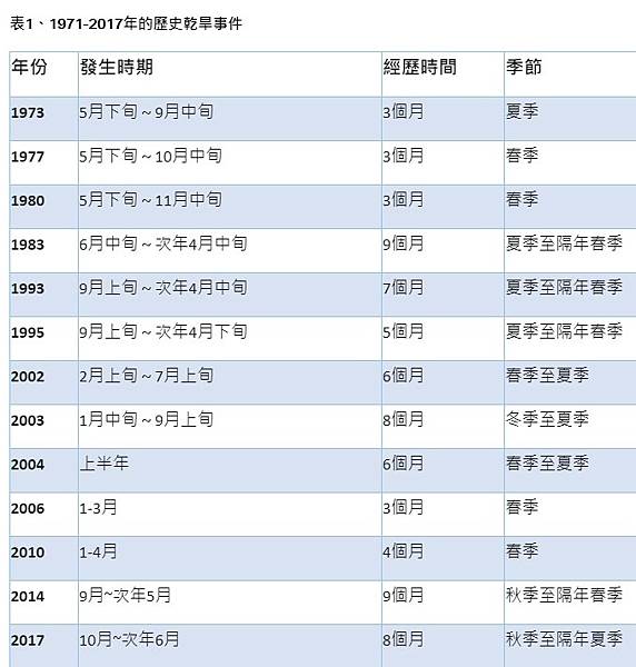 依據過去四十多年的乾旱事件統計,可以發現我國的乾旱災害通常發生在春季,偶爾會持續四、五個月之久,甚至在2002年至2004年期間,發生連續三年平均將近7個月的嚴重乾旱事件。通常乾旱事件必須等到夏季明顯降雨,方能解除旱象(表1)。[3.4.5]