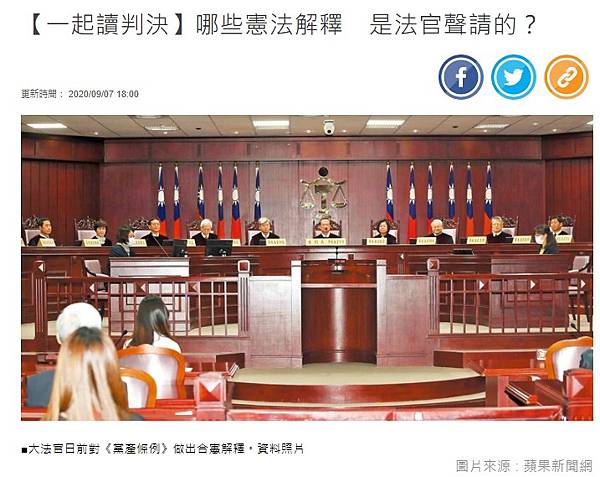 【一起讀判決】哪些憲法解釋 是法官聲請的?更新時間: 2020/09/07 18:00 蘋果日報 https://bit.ly/3rZUbUm
