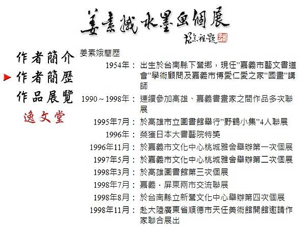 出生於台南縣下營鄉,現任”嘉義市藝文書道會”學術顧問及嘉義市博愛仁愛之家”國畫”講師