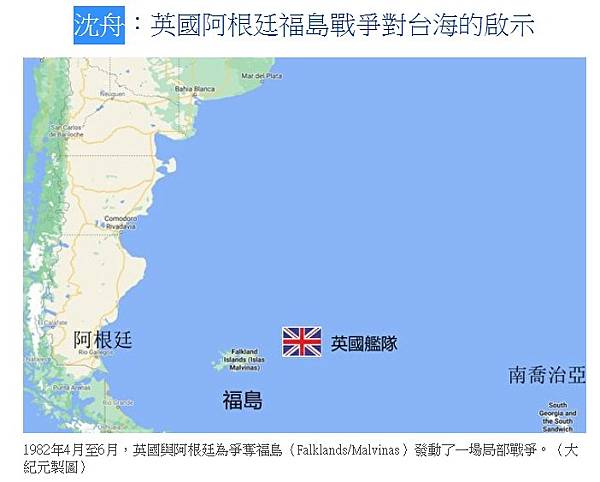 大紀元2021年04月19日訊】1982年4月至6月間,英國和阿根廷為爭奪英國海外領土福島(英文Falklands,西班牙文Malvinas馬島)爆發了一場局部戰爭。英國出動了航母艦隊,並最後取得了勝利;阿根廷軍政府因失敗下台。這場戰爭對日趨緊張的台海局勢或許有些啟示。沈舟:英國阿根廷福島戰爭對台海的啟示 | 台灣 | 航母 | 危機 | 大紀元 https://bit.ly/2QmcaYt