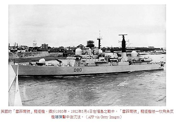 英國的「雪菲爾號」驅逐艦,攝於1980年。1982年5月4日在福島之戰中,「雪菲爾號」驅逐艦被一枚被飛魚反艦導彈擊中後沉沒。(AFP/AFP via Getty Images)