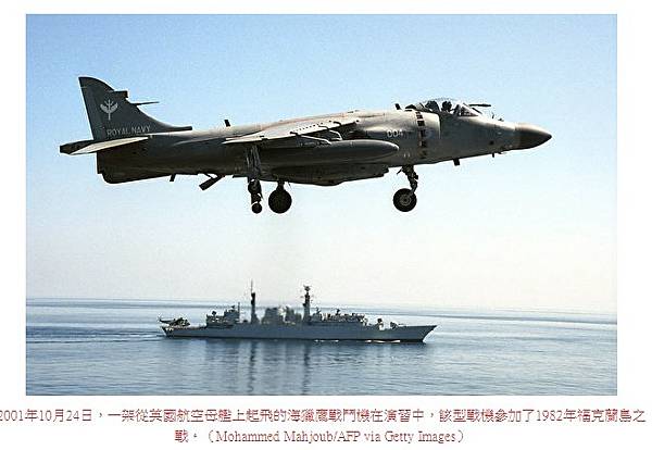2001年10月24日,一架從英國航空母艦上起飛的海獵鷹戰鬥機在演習中,該型戰機參加了1982年福克蘭島之戰。(Mohammed Mahjoub/AFP via Getty Images)