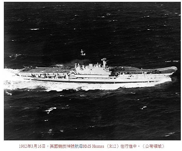 1982年3月16日,英國競技神號航母HMS Hermes (R12)在行進中。(公有領域)